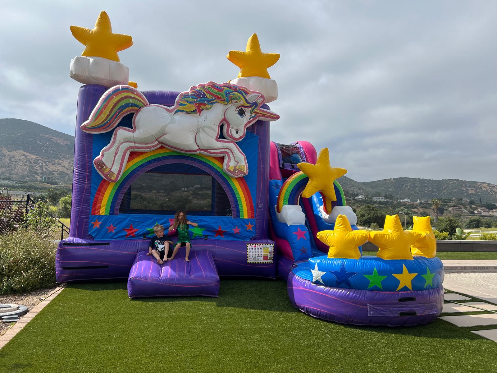 The 5 in 1 Unicorn Water Slide combo has quickly become one of the preferred inflatable water slide rentals for boys and girls alike.